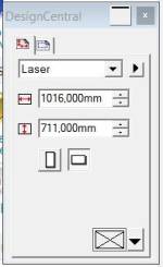 Når man henter opp en tegning på en pdf-fil så vil man normalt få et avmerket område på tegneflata som er lik den man henter opp. Det enkleste er någjøre skrive flate like stor som skrivebordet til laserkutteren, dvs. ca. 1000 x 600 mm. Dette gjøres ved å venstreklikke på skriveplata i programmet ved siden av menyene. Da kommer menyen vist på figuren til høyre opp. Velg fanen til venstre og velg pila til høyre i innboksen. Velg formatet laser nederst i nedtrekksmenyen og pass på at formatet er liggende (under midten av menyen). Skriveflaten er da lik bordet til laseren.